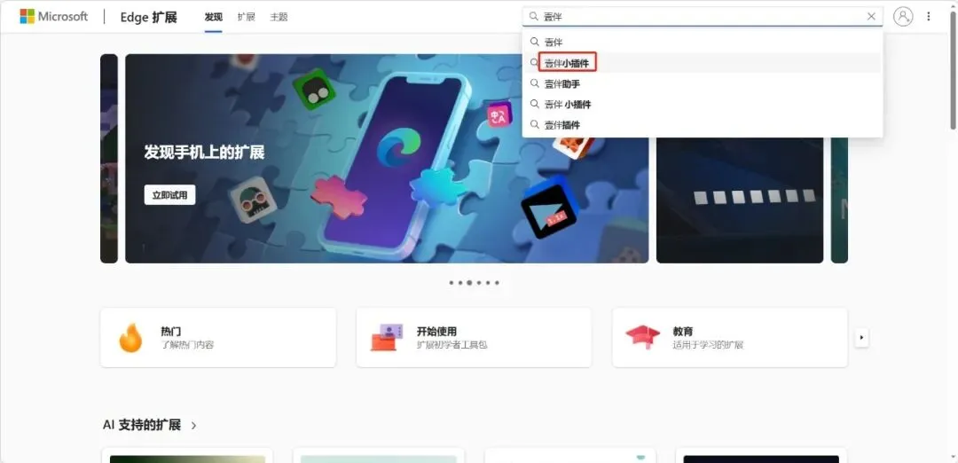 在页面的搜索框中输入 “壹伴” ,搜索框弹出的下拉列表中,选择 “壹伴小插件” 即可显示安转的插件列表。