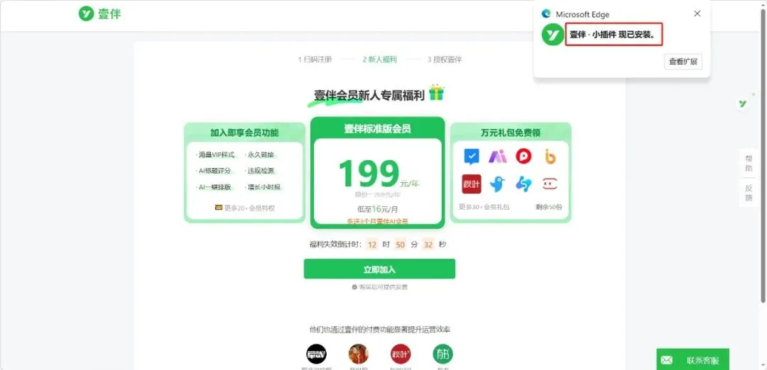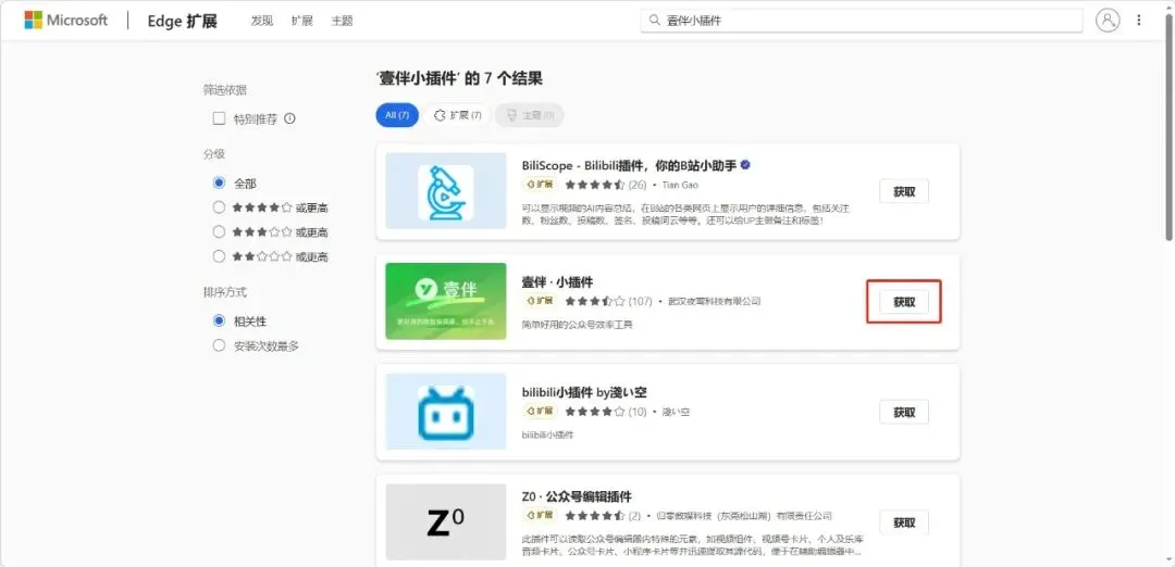 找到 “壹伴 . 小插件” 后,点击 “获取”,然后会弹出一个提示框,再点击 “添加扩展” ,有弹出消息“壹伴.小插件 现已安装”就表示已经大功告成。