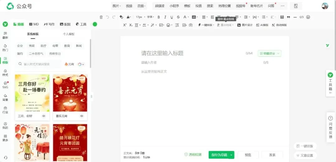 安装这款插件后,不仅可以改变写作文章的字体,还能重点划虚线,甚至还有精美的模版可套用,违规检测,图片生成等功能。不过,天下没有免费的午餐,这款插件是收费的。当然免费的也能用,只不过使用功能受限,像改字体、划重点等基础常用的功能还是可以免费用,这些也够新手使用。