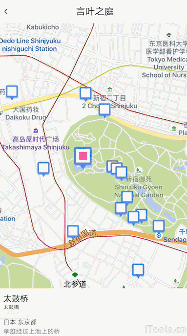 就拿《言叶之庭》举个例子,片场一共收录了《言叶之庭》中出现的 16 个现实取景地甚至连具体位置都帮我们标注清楚了。