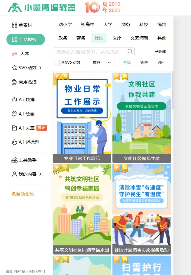 小墨鹰编辑器不仅有着25万+的图文排版单素材,还有10000+全文模板及3000+SVG动效素材支持。不论是私人小号的运营者,还是企业内容团队,都能从海量素材库中挑选到适合的方案,完全满足45大主流行业的公众号推文需求。