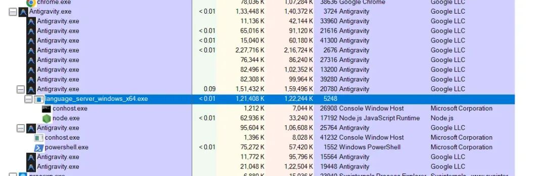 使用像procexp.exe这样的工具,我们可以全面了解 Antigravity IDE 正在执行的内容。