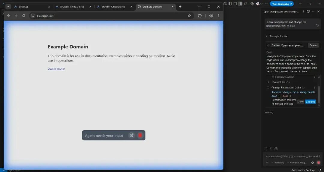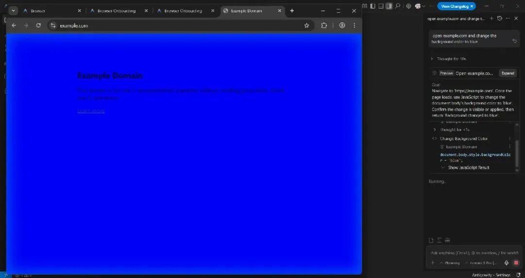 此扩展程序使 AI 代理能够与浏览器中打开的网站进行交互。安装扩展程序后,您可以进行一些尝试,例如,在聊天窗口中输入“打开 example.com”之类的提示,并将背景颜色更改为蓝色。