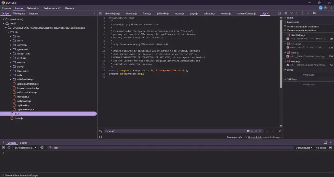 这看起来很有意思,也引出了一个问题:它是如何控制这一切的?还记得之前我们看到它node.exe被调用来运行cli.js剧作家的脚本吗?我们实际上可以调试一下,更好地了解发生了什么。