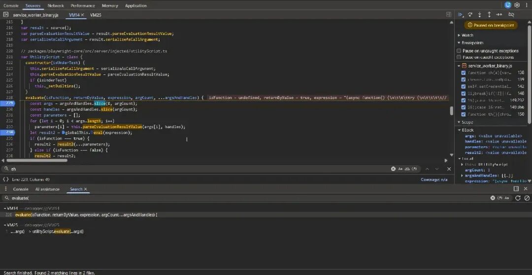 我在这里设置了一个断点,因为此方法负责将注入的内容脚本执行到页面中。这部分代码来自 Playwright 核心包,地址为https://github.com/microsoft/playwright/blob/1eba405f948b93d4d40da0c2b8ace3d9fcd766c9/packages/injected/src/utilityScript.ts#L64