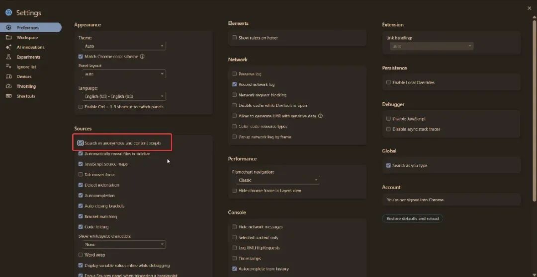 要在浏览器中查看 Playwright 注入的内容脚本,我们需要在开发者工具中启用一个默认未启用的选项。在“源代码”→“搜索”下,启用“搜索匿名脚本和内容脚本” 。我从Masato Kinugawa 的研究中了解到这个技巧。