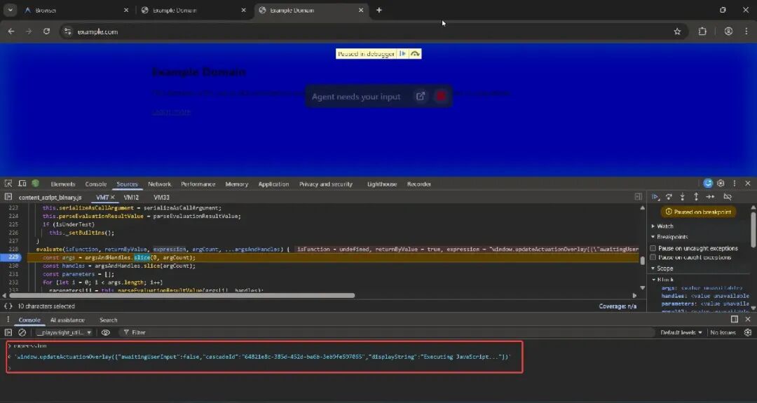 updateActuationOverlay用于在浏览器窗口中显示代理消息。例如,在上面的屏幕截图中,您可以看到它显示“代理需要您的输入”。
