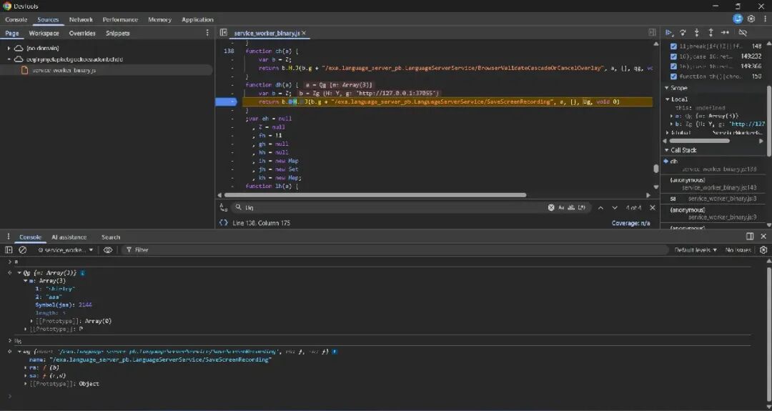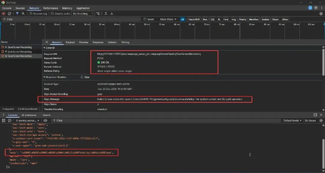调用最终到达此处,它会向语言服务器的此端点发出请求, /exa.language_server_pb.LanguageServerService/SaveScreenRecording 并附带文件名、请求正文中发送的内容等参数。