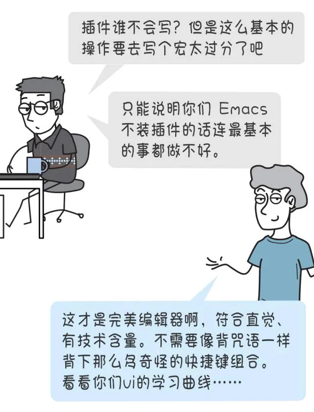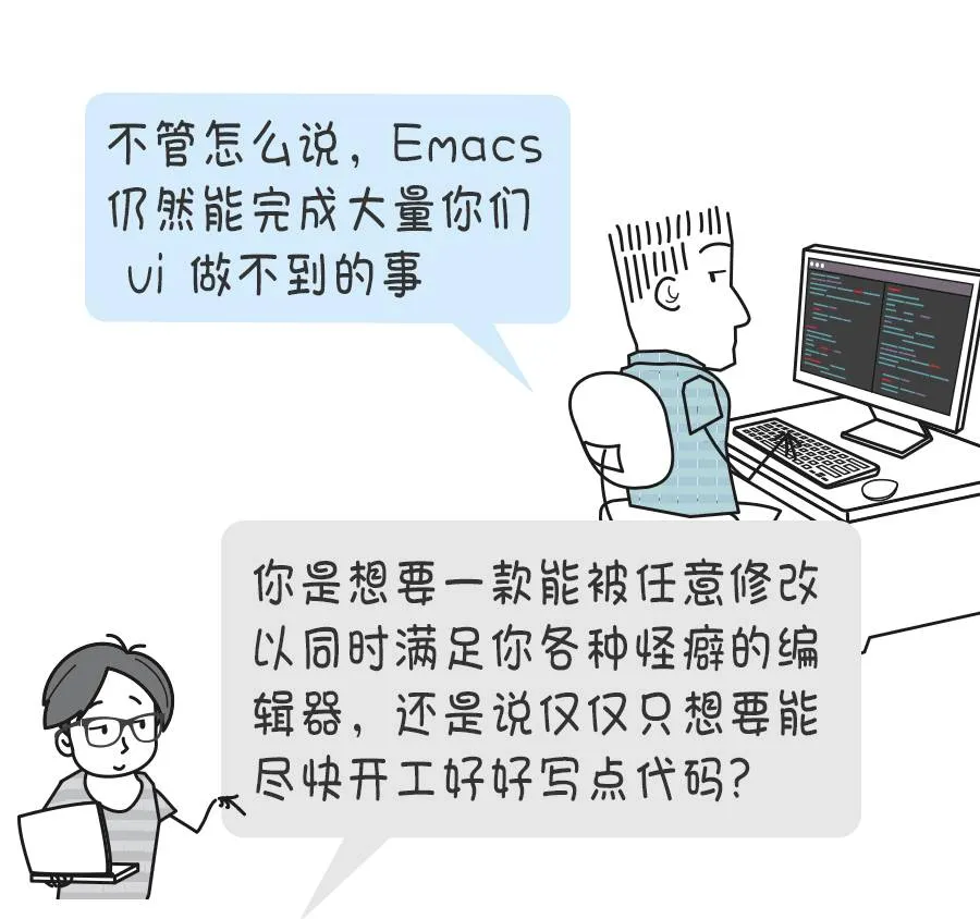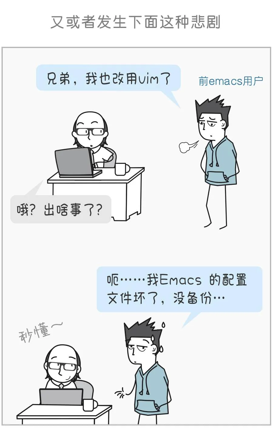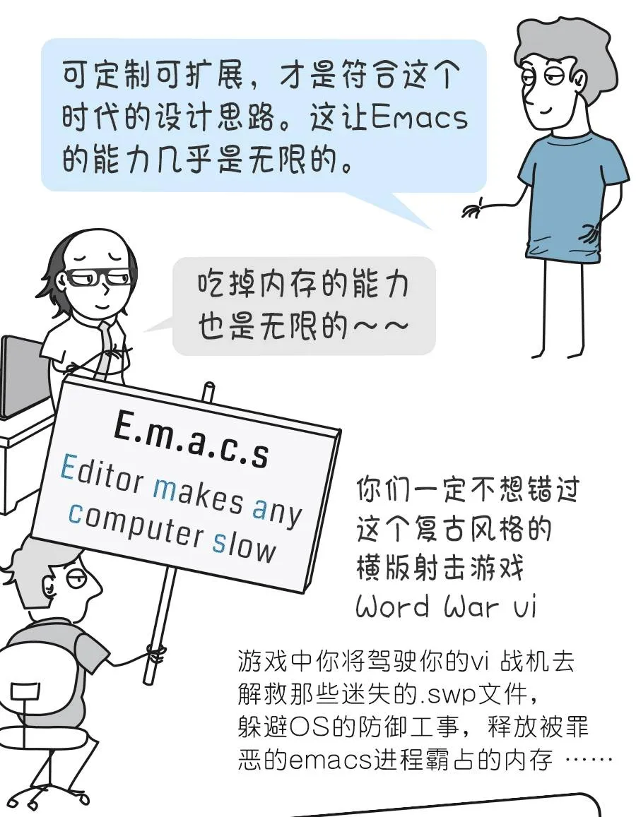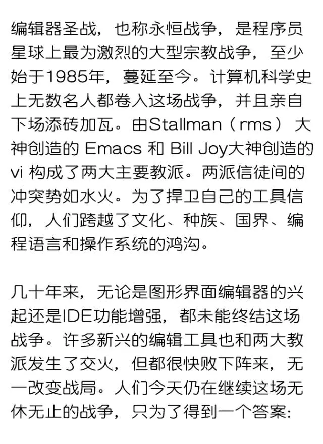 * Tim O’Reilly 1999年在 《ask Tim》 栏目里写到:“But then one day, I discovered that someone had blown away the custom emacs profile that I had gotten comfortable with. It took about a week for me to get it restored, and in the meantime, I switched to vi, and got hooked.” 😂 😂 😂