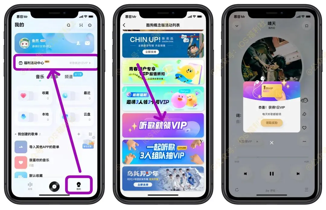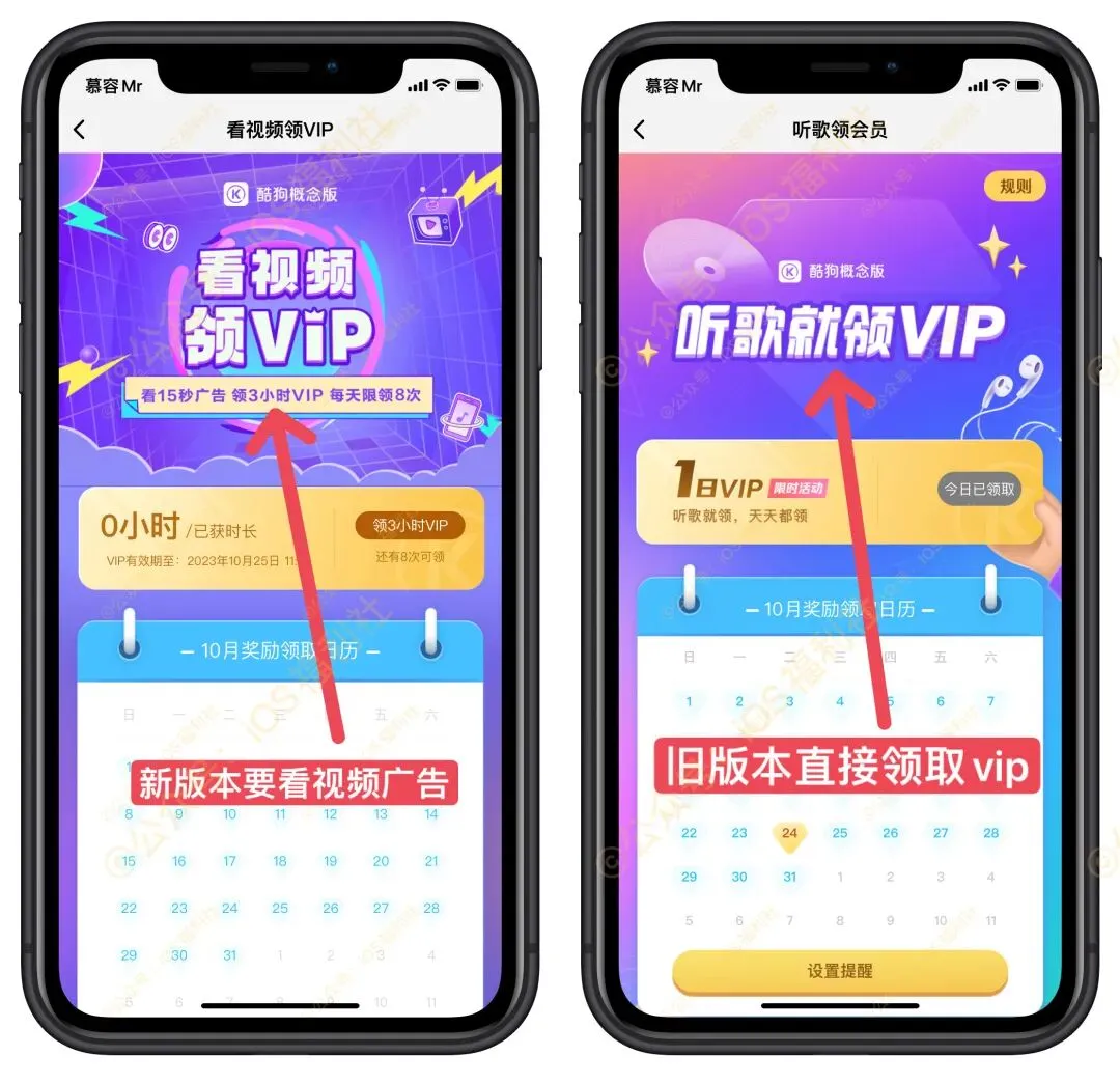 如果你是老用户,并且把酷狗音乐概念版升级了最新版本,那么领取VIP就需要看15秒的视频广告,才能领取3个小时的VIP。而旧版本依旧是只要听歌1秒就可领取1天的VIP会员。所以”破解方法”就简单了: