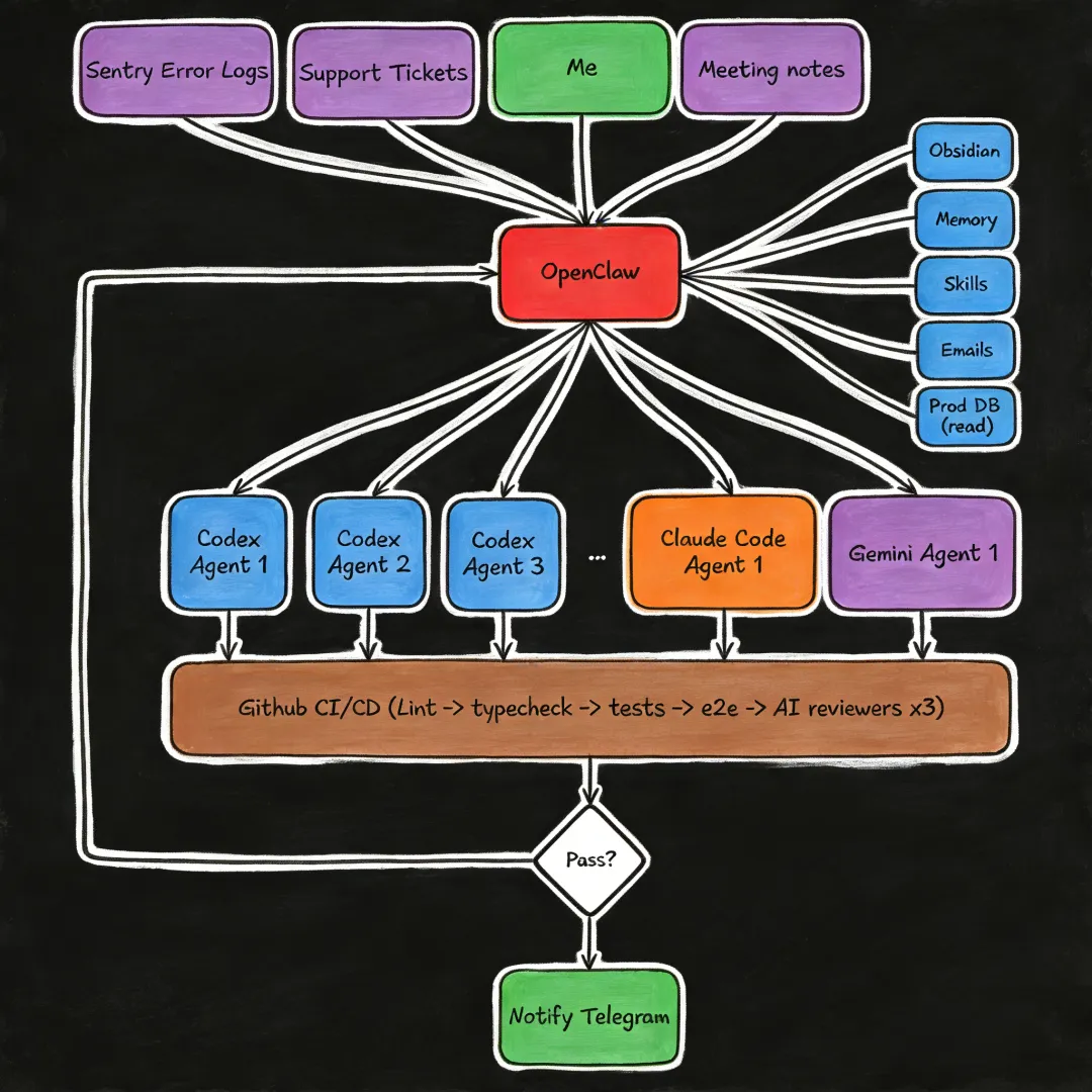 我的 Git 历史看起来像我刚雇了一个开发团队。实际上只有我一个人,只是从“管理 Claude Code”,升级成“管理一个 OpenClaw 智能体”,再由它管理一组其他 Claude Code 和 Codex 智能体。
