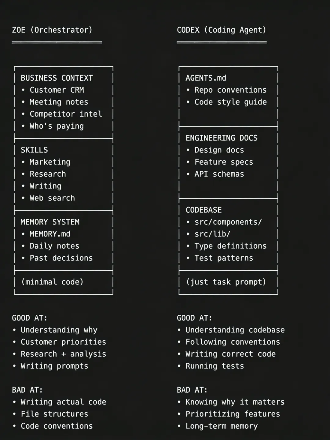 Zoe 会为每个任务选择正确智能体,并在它们之间路由输出。计费系统 bug 给 Codex。按钮样式修复给 Claude Code。新仪表盘设计先从 Gemini 开始。