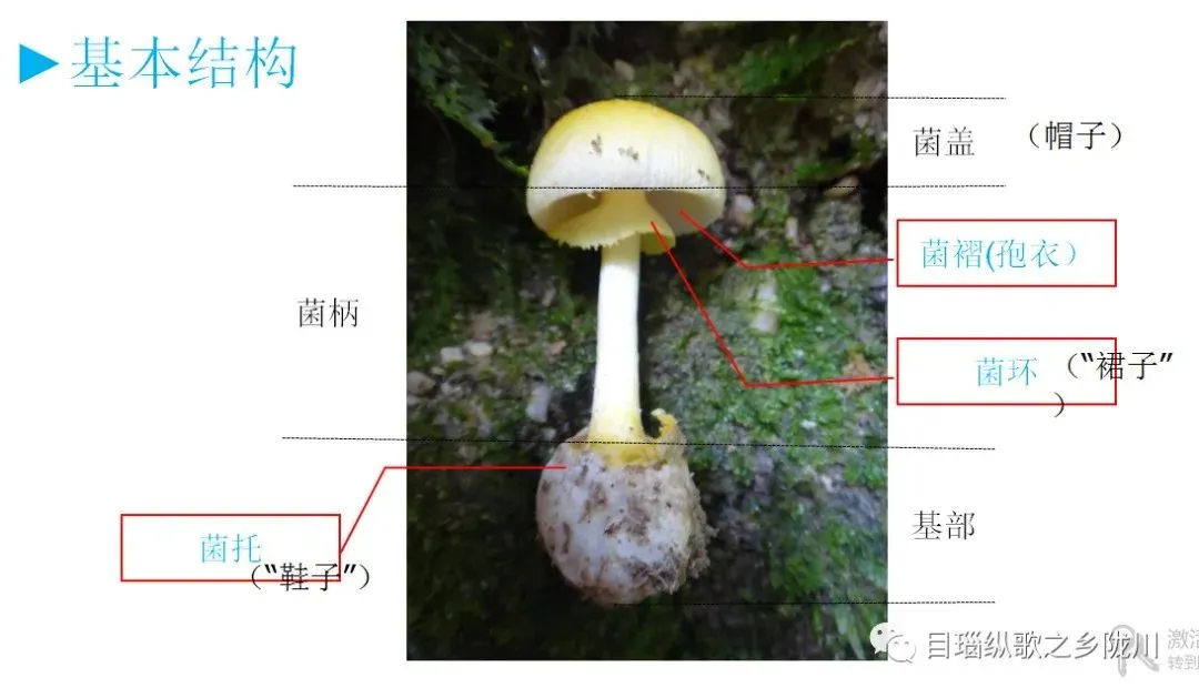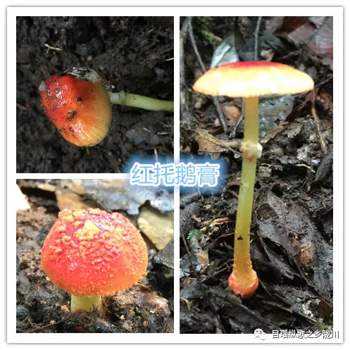 (1)红托鹅膏:生长于枯木林中;菌盖橘红色,有黄色鳞状颗粒,顶部颜色深,边缘较浅;菌褶白色束状;菌柄白色,附有黄色鳞状颗粒,有菌环;基部有菌托,呈粉红色。