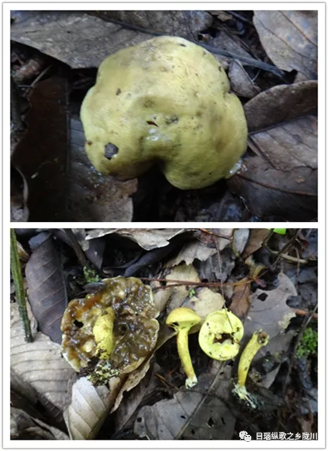 2、黄粉沫牛肝菌:菌盖、菌柄呈黄色,菌褶呈咖啡色,孔状,损伤不变色。