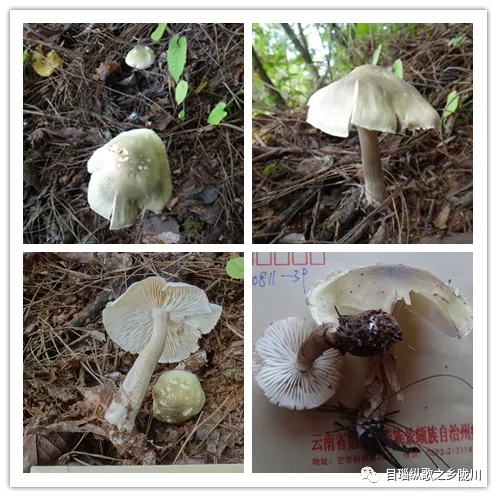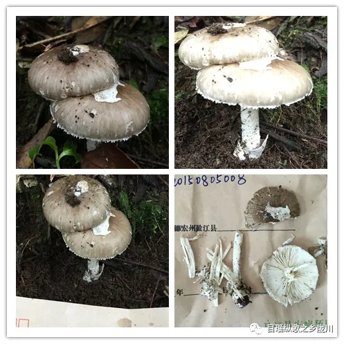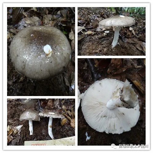 假褐云斑鹅膏菌:形似“青鸡枞”,长10~15cm;菌盖乌黑色,顶部较深;直径10cm,左右;菌褶、菌柄呈白色,有菌环和菌托。
