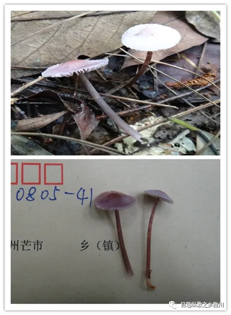 2、洁小菇:小菌株,呈紫色;菌盖颜色较浅,菌柄颜色较深,空心;菌褶稀疏束状,呈粉色半透明