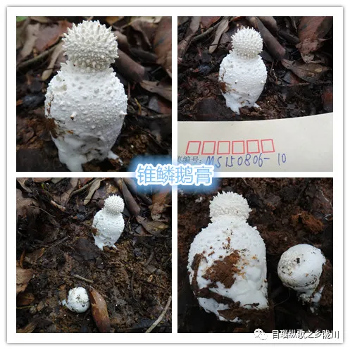 (4)锥鳞鹅膏:生长于栎树林中;全菌纯白色,无明显的菌盖、菌柄、基部;全菌呈球状,有白色锥形鳞状凸起,顶部较密集和细长。