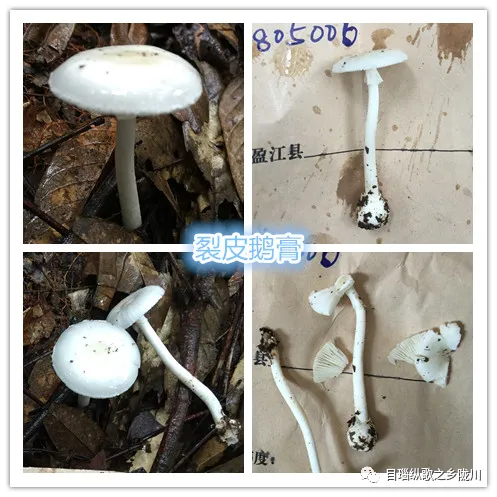 (5)裂皮鹅膏:菌盖白色光滑;卷子白色束状;菌柄细长,有灰色鳞状纹;有白色菌环和菌托。