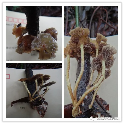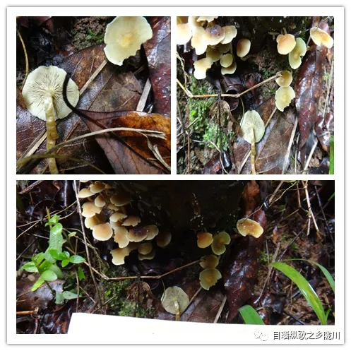 (1)丛生垂暮菇:多寄生于枯木上;菌株较细小呈黄绿色,菌盖顶部颜色较深,损伤不变色,熟透后变咖啡色;菌柄空心。