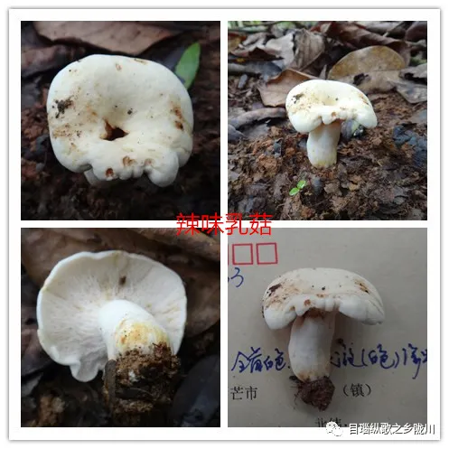 (2)辣味乳菇:当地俗名“白辣菌、石灰菌”;生长于栎树林中,全菌白色,损伤不变色,但有白色浆液渗出;菌褶不规则