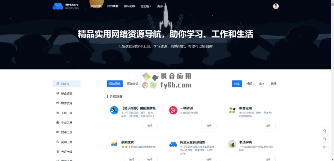 网站左侧提供工具的分类索引栏:综合资源、媒体资源、下载工具、专业工具、效率工具、实用工具、考证考级、有趣合集、急求资源…
