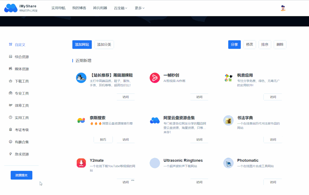“自定义栏”,你还可以添加自己喜欢的网站或添加自己想要的分类,接着修改、排序、删除,你想怎么搞就怎么搞