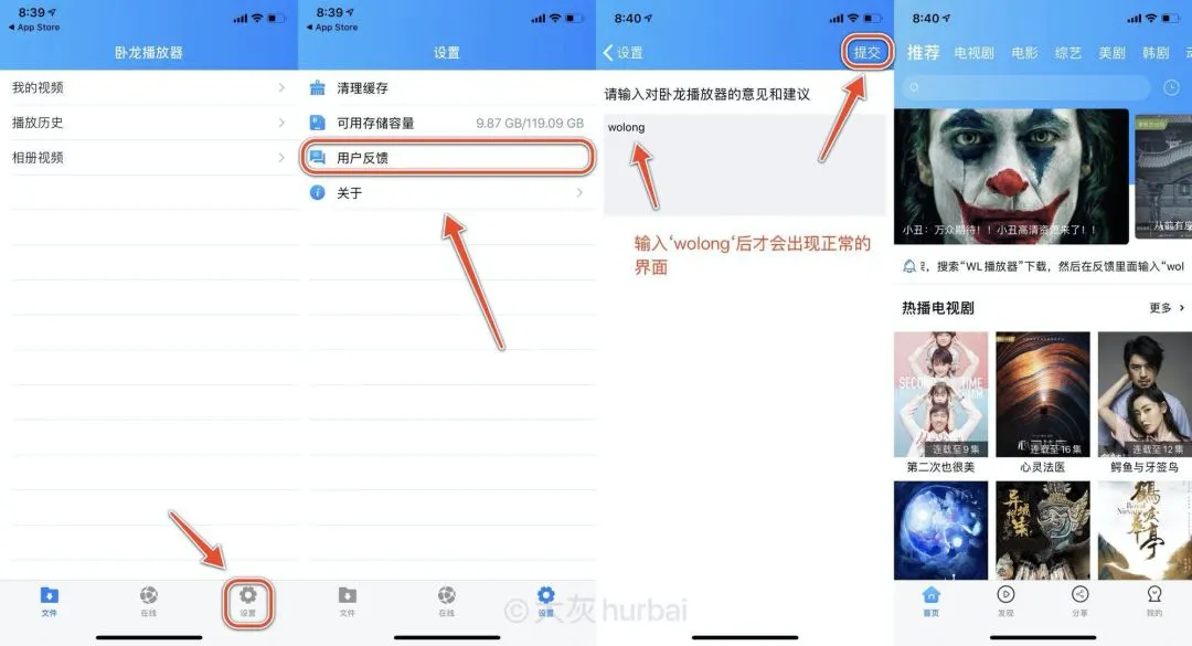 下载后打开点击设置–用户反馈,在输入框输入’wolong‘,然后点击提交才能看到影视界面。