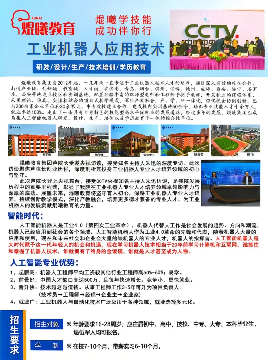 在央视朱迅专访中,焜曦教育芦院长深度分享行业发展!多年扎根工业机器人领域,锚定智能化发展趋势,聚焦技术落地与场景拓展;针对行业人才缺口,依托焜曦教育专业培养体系,定向培育工业机器人“指挥官”,为产业升级注入强劲动能!