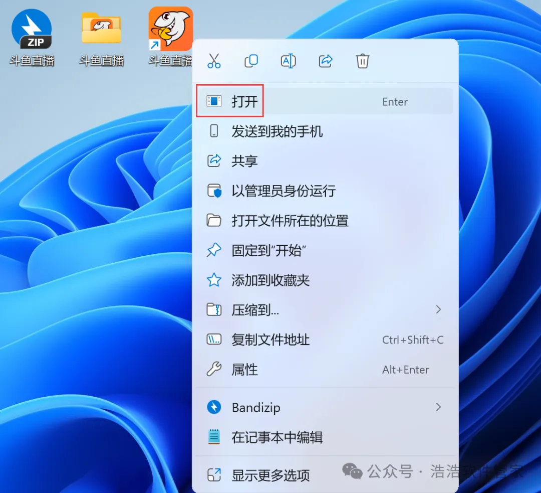 8、回到桌面,右键桌面上的【斗鱼直播软件图标】,点击【打开】