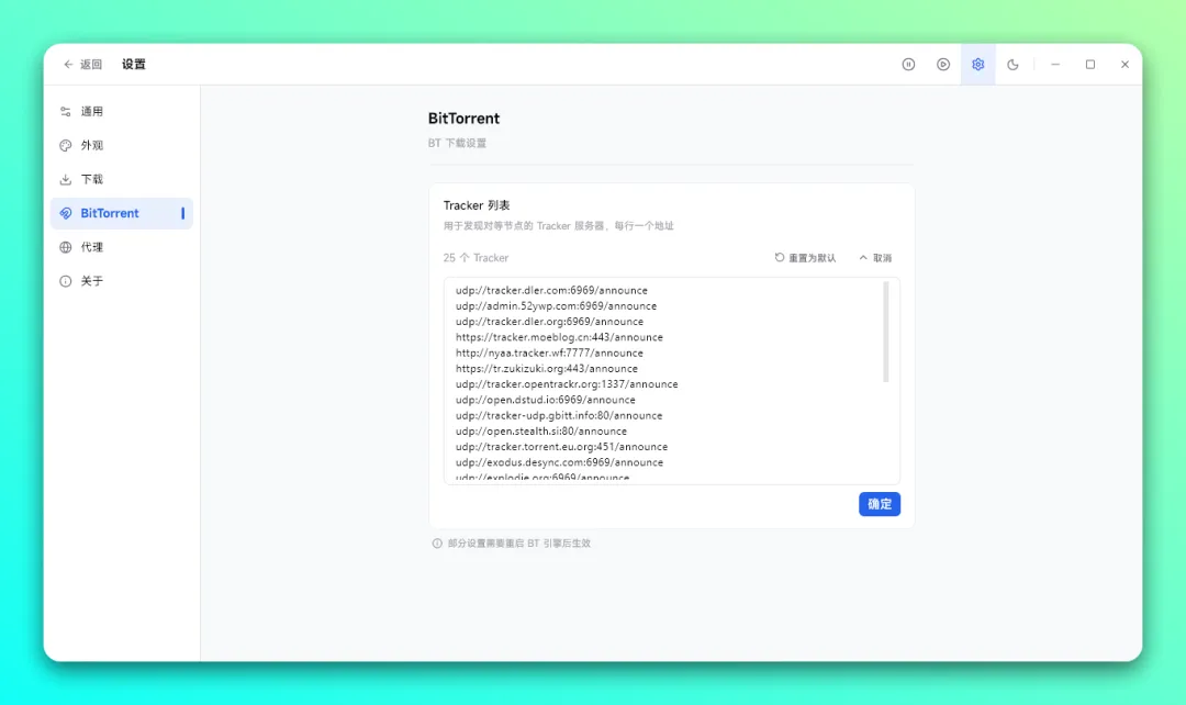 在 BitTorrent 磁力链接下载方面,提供了 Tracker 列表功能,默认自带了 25 个 Tracker 列表,你也可以手动添加更多列表,下载热门 BT 资源速度应该没问题。