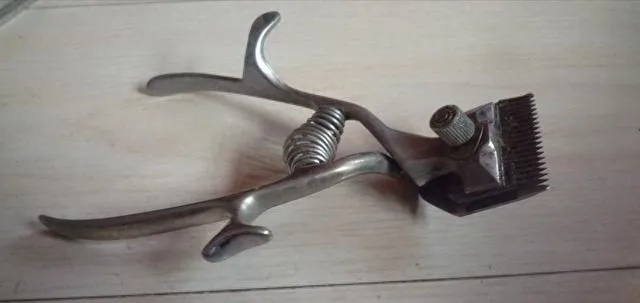 这只弹簧夹手的是手动理发推子,螺丝松紧一分,咔嚓一下顺着后脑勺走,头发从齿间蹦出来,小孩坐不住被夹了一下就“哎呦”,师傅为省事一拉就过,回家照镜子两边还真齐,便宜实在。