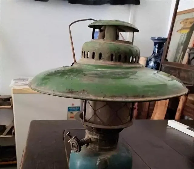 这个绿帽檐的就是汽灯,下头拧上油壶,先加煤油再打气,点燃灯头,白光呼地一下亮起来,晚自习我把本子往外挪一点,灯芯一抿光又大一格,屋里影子忽闪忽闪,风不大在院里也能照一片。