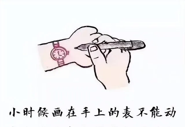 这张画面你一看就笑,手腕上画的手表,钢笔圈上去再点几点刻度,谁也不愿意洗掉,放学时同学对着比时间,嘴里还学大人说快了慢了,那时候想要真表想得牙痒痒,现在手机抬眼就有点,心气儿倒没当年那股劲。