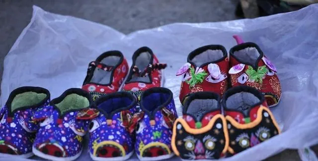 这一排小鞋叫虎头鞋,红的黑的蓝的,鞋面绣着胡须和眼睛,塞了棉絮软乎乎,姥姥把鞋底一层层纳齐,猫眼针穿过来带出细细的线,冬天穿上脚背不凉,拍照的时候小孩还要学老虎吼一嗓子。