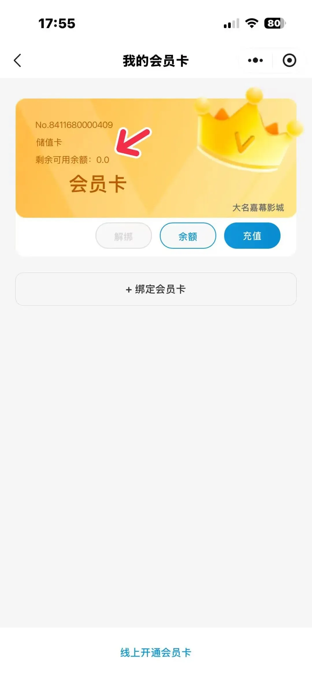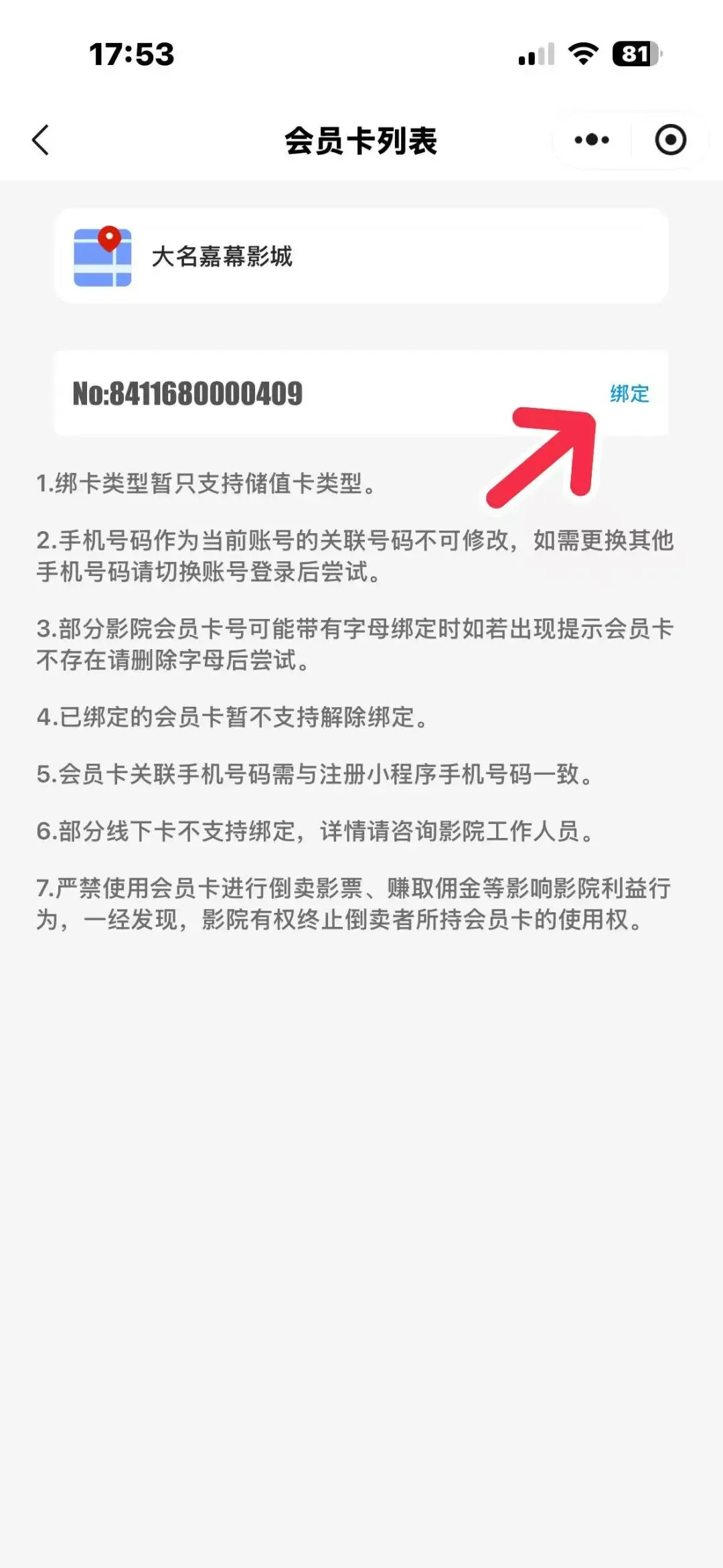 3.点击绑定会员卡(自动识别手机号已有的会员卡)