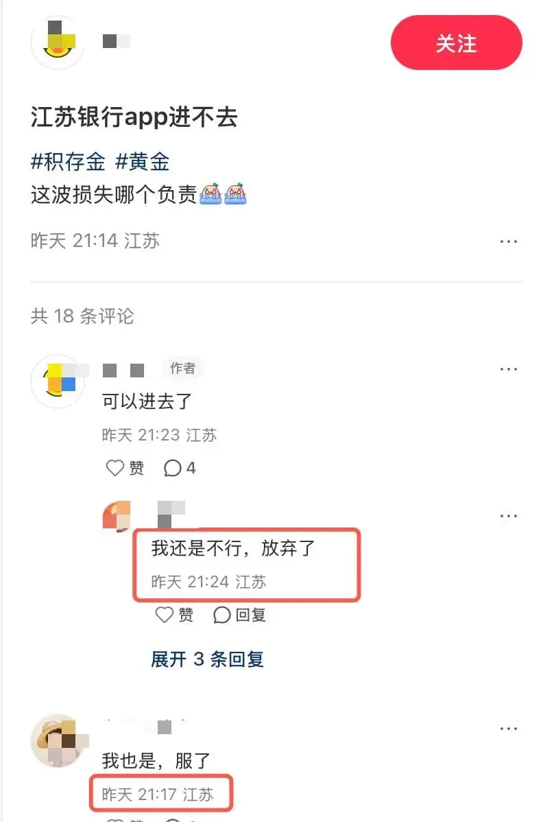江苏银行APP深夜宕机?网友吐槽“金价大跌却买不了”