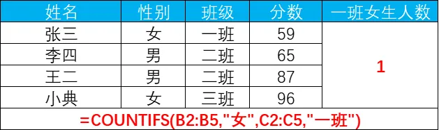 书写规则:=countifs(区域1,条件1,区域2,条件2)