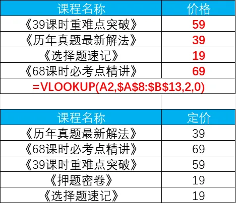 精确匹配:(题目要求:根据课程名称求对应的定价)