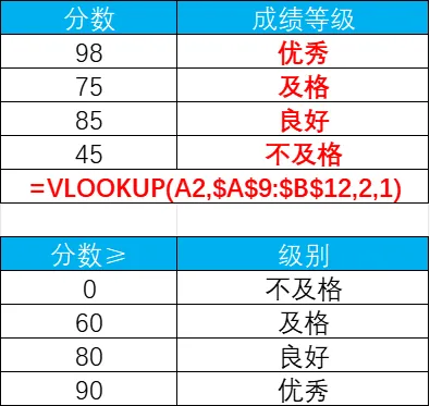 近似匹配:(题目要求:根据分数查询成绩等级)
