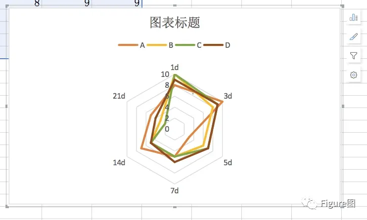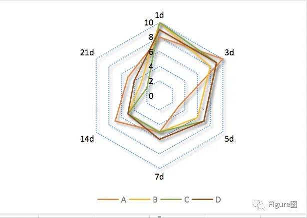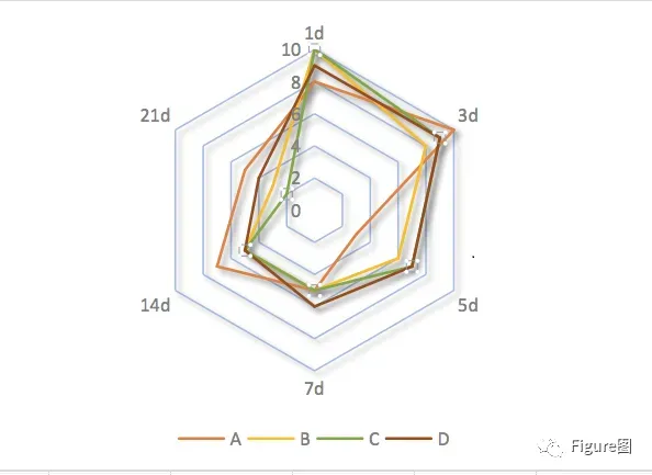 3. 插入后,默认的图如下所示,是不是很像蜘蛛网。这张雷达图显示的是A-D四个类别的系列在时间轴上的变化及在相同时间段内的评分差异。最外圈显示的文字为时间点,0-10则为每圈对应的坐标轴。