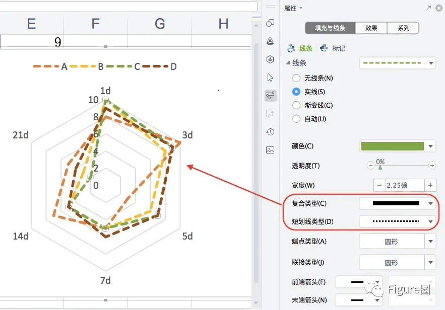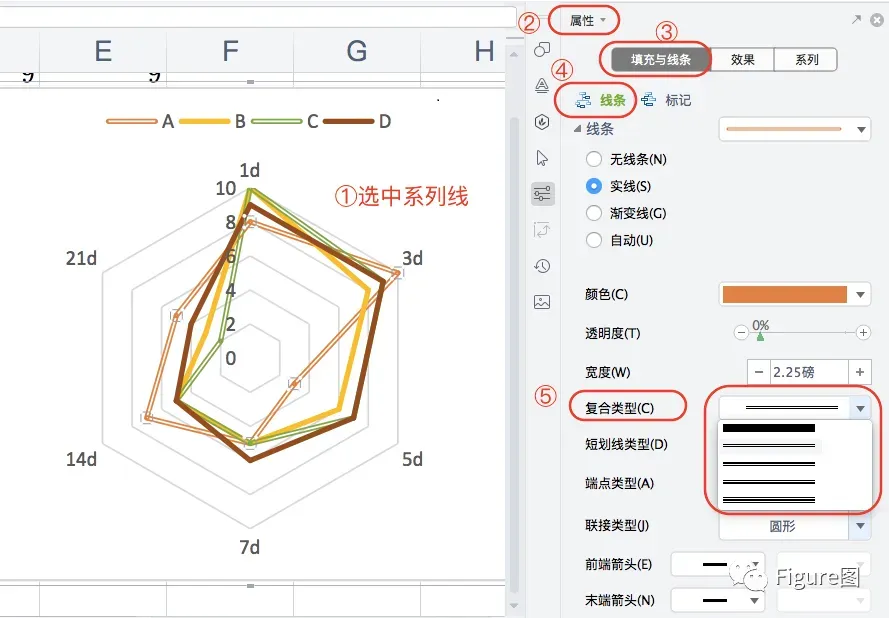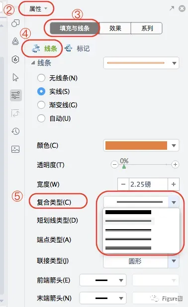 4. 如果觉得实现比较呆板,我们可以选择相应的系列,通过“属性”→“填充与线条”→“线条”→“复合类型”选择想要变化的线型。