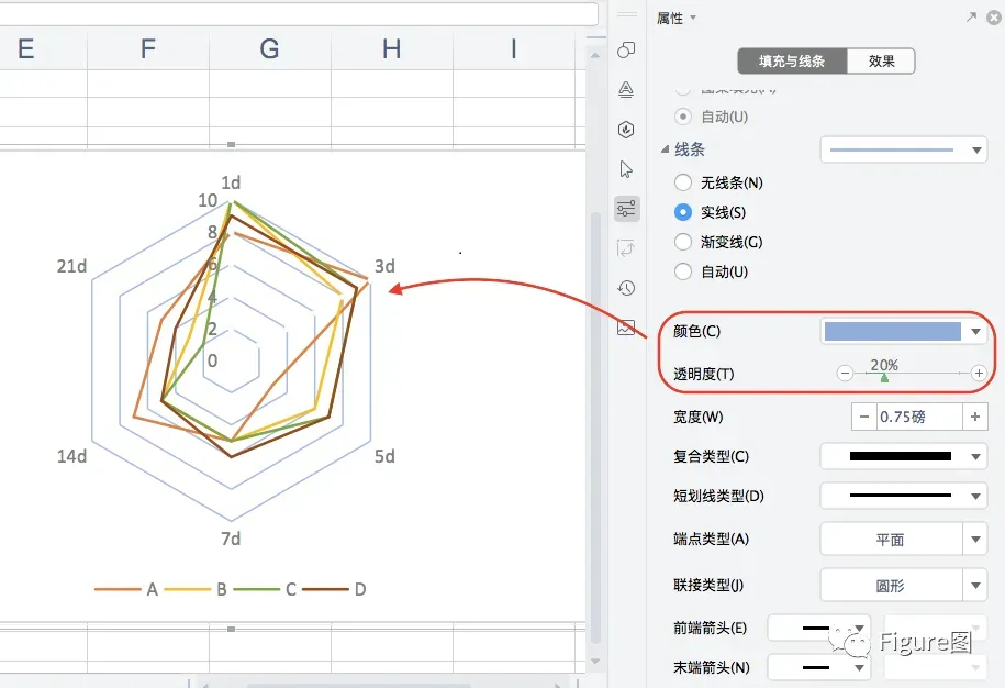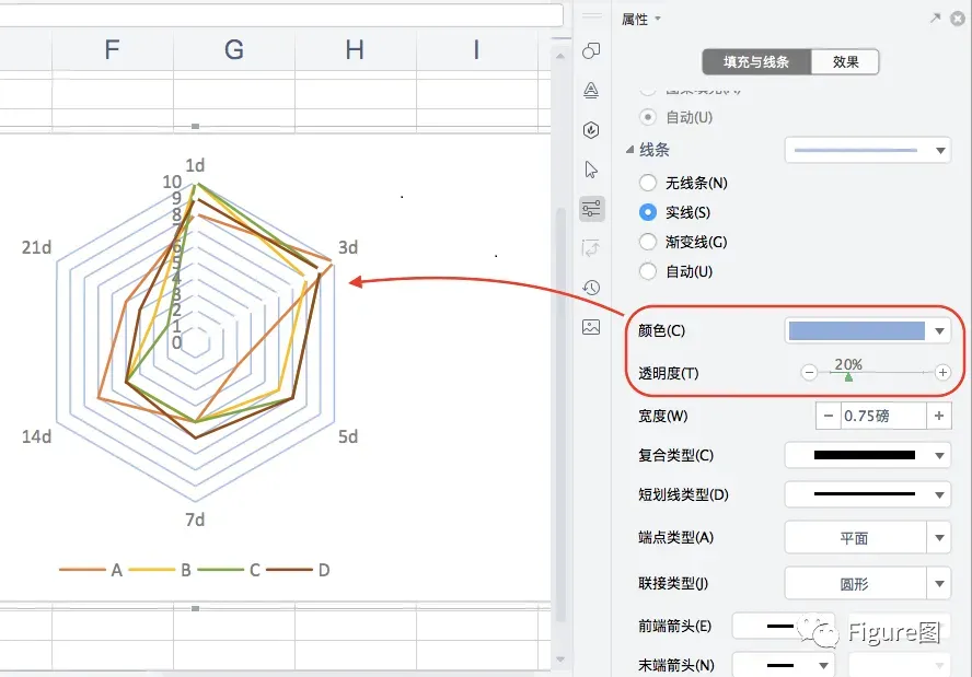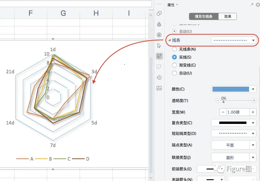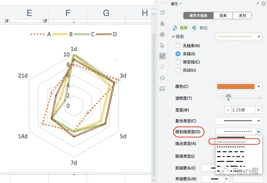 13. 同样,也可将底图的线条予以更换不同类型,使其与A-D显示的雷达图线条区分开来。