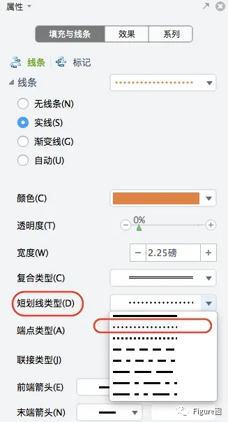 6. 或者进一步通过“属性”→“填充与线条”→“线条”→“短划线类型”可以变成不同类型的虚线,有圆点、方点、短划线等等很多类型。