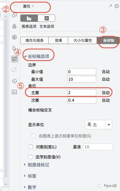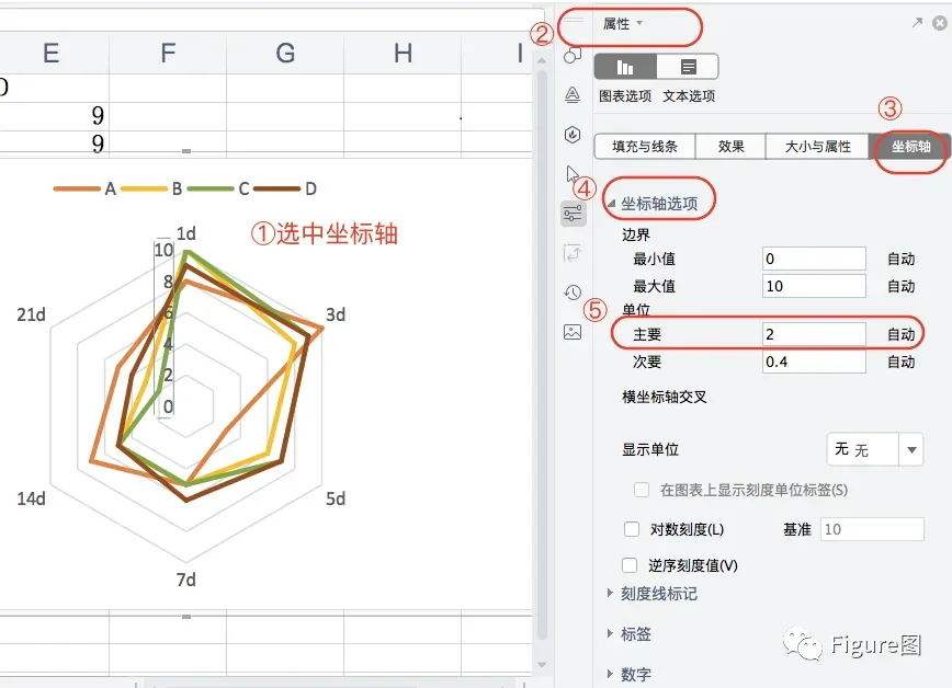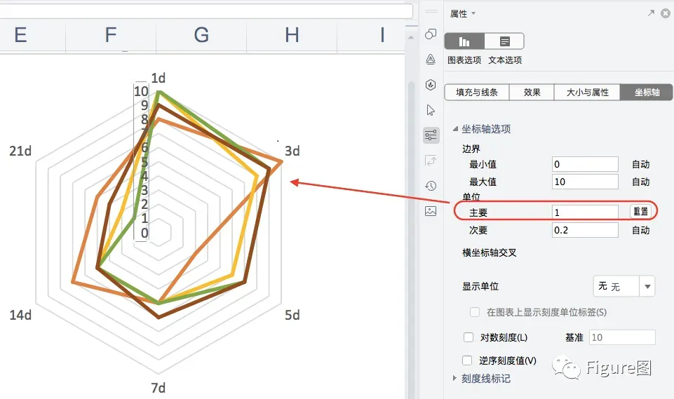 10.所以我们也可以通过“属性”→“坐标轴”→“坐标轴选项”→“主要单位”将间隔距离改成1,这样可能使数值点比较直观(不过蛛网会显得比较密集)。