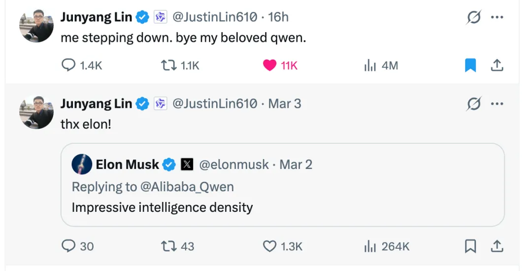 后脚凌晨在 X 上发了句“me stepping down. bye my beloved qwen.”(我卸任了,再见了,我亲爱的千问),直接官宣卸任千问技术负责人。