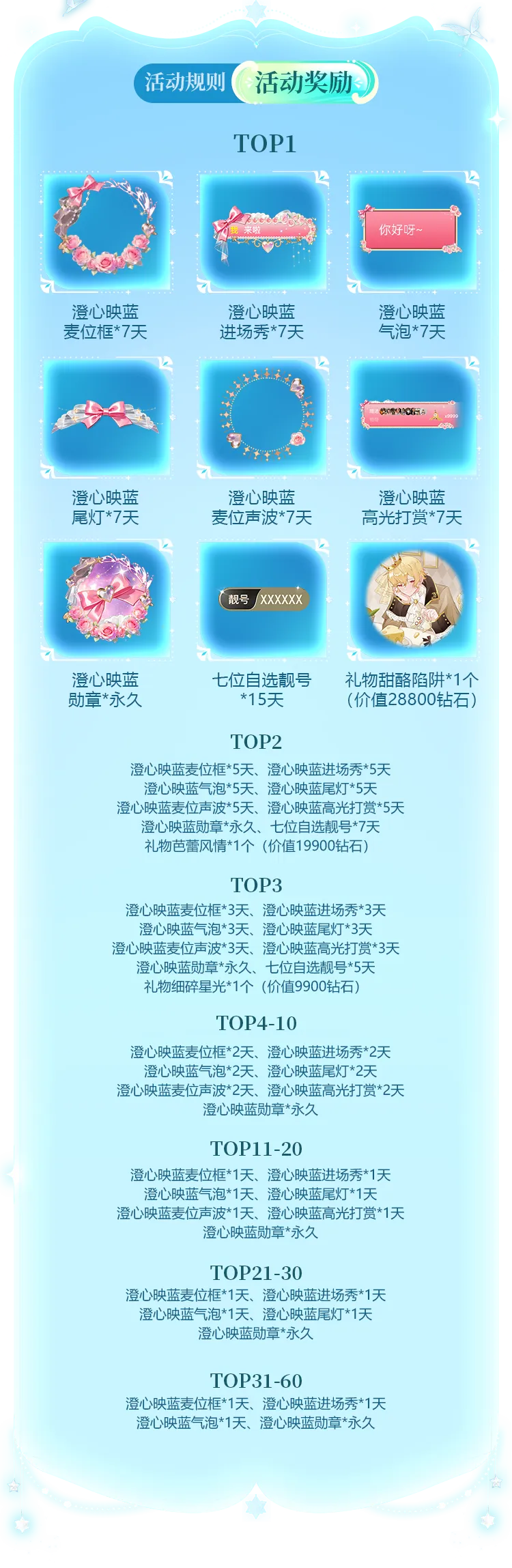 5、活动期间,房间每日统计通过该玩法获得的映蓝值,1钻石=1映蓝值,当映蓝值达到指定数值时候,该房间将获得一定奖励,活动期间上线的三款等价盲盒均计入映蓝值计算
