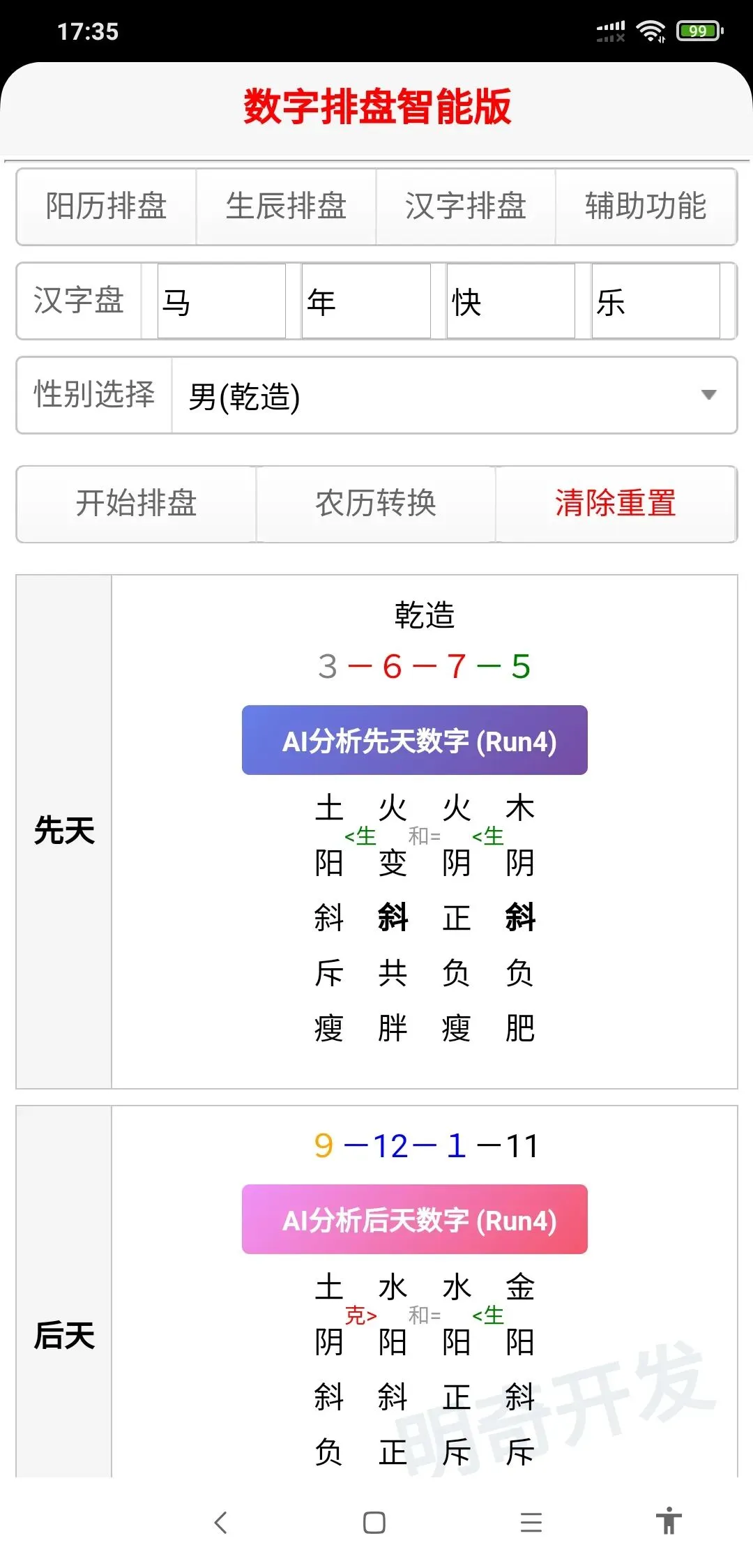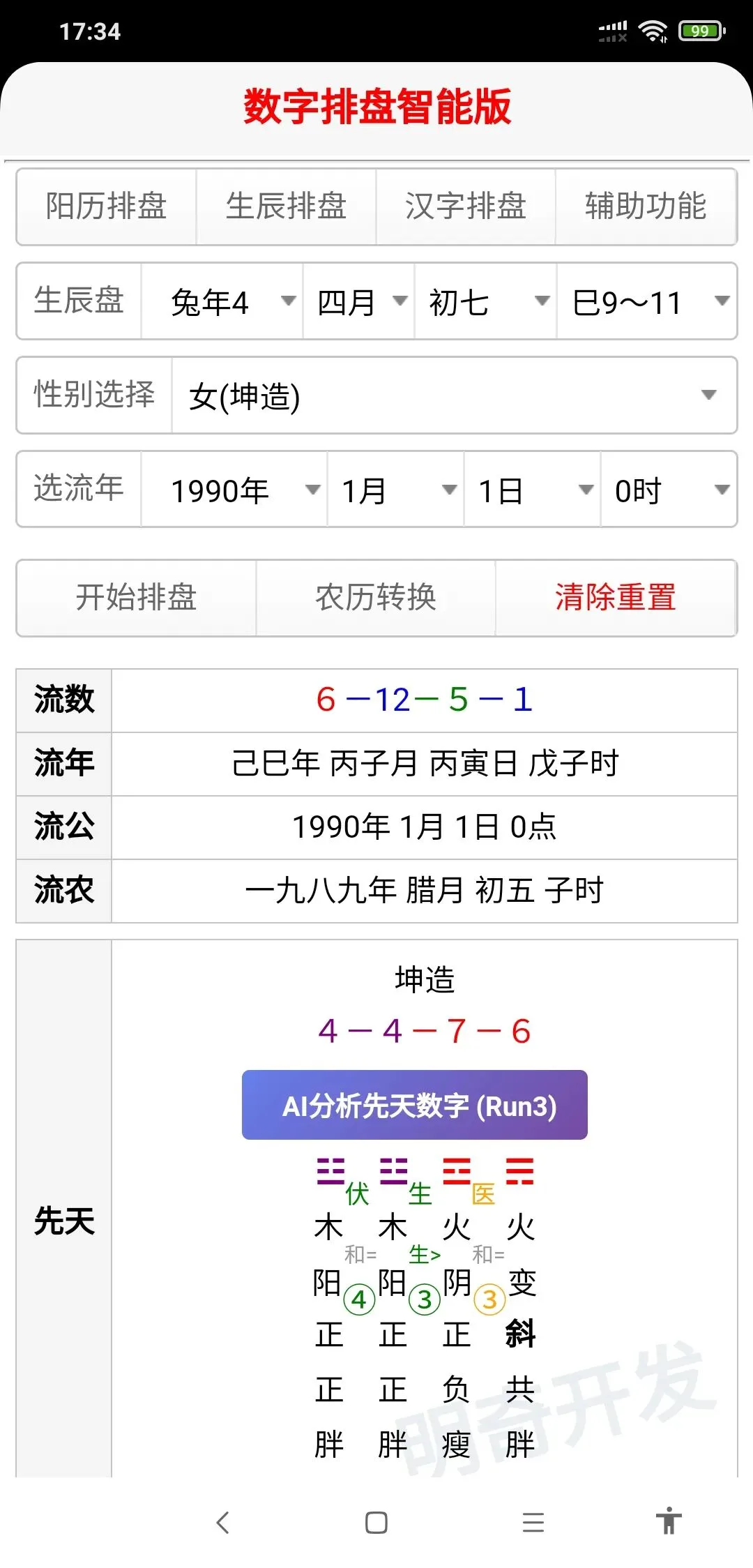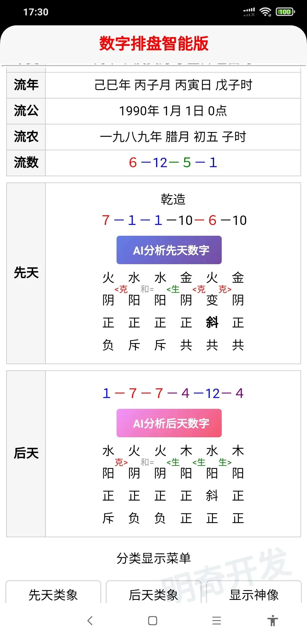 打开排盘软件,选择任意模式排盘,点开始排盘,会看到起盘结果显示有AI分析先天数字,AI分析后天数字,输入或者粘贴密钥,会自动记住你的密钥,不需要再次输入,点执行分析即可,等待一会,会显示大模型分析结果。