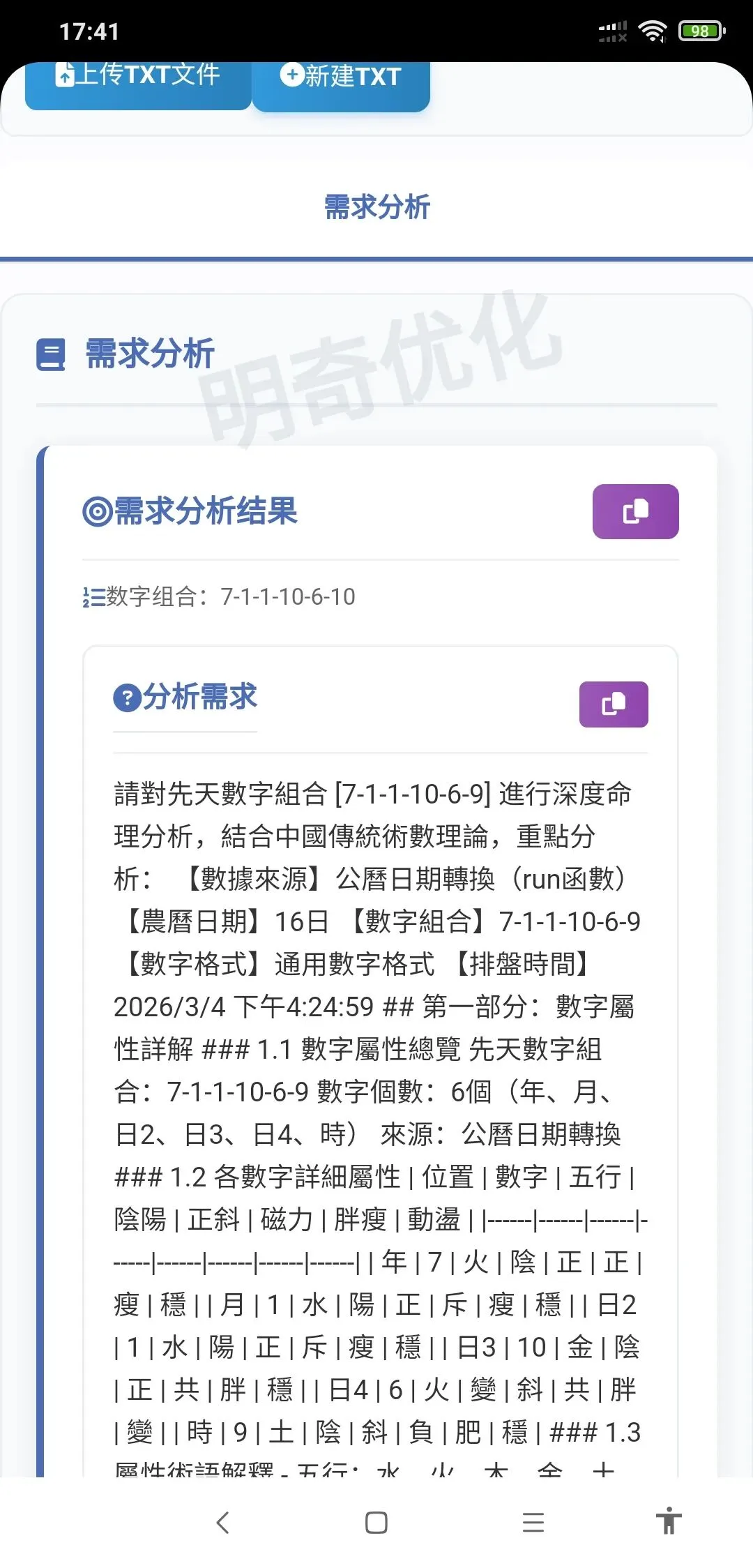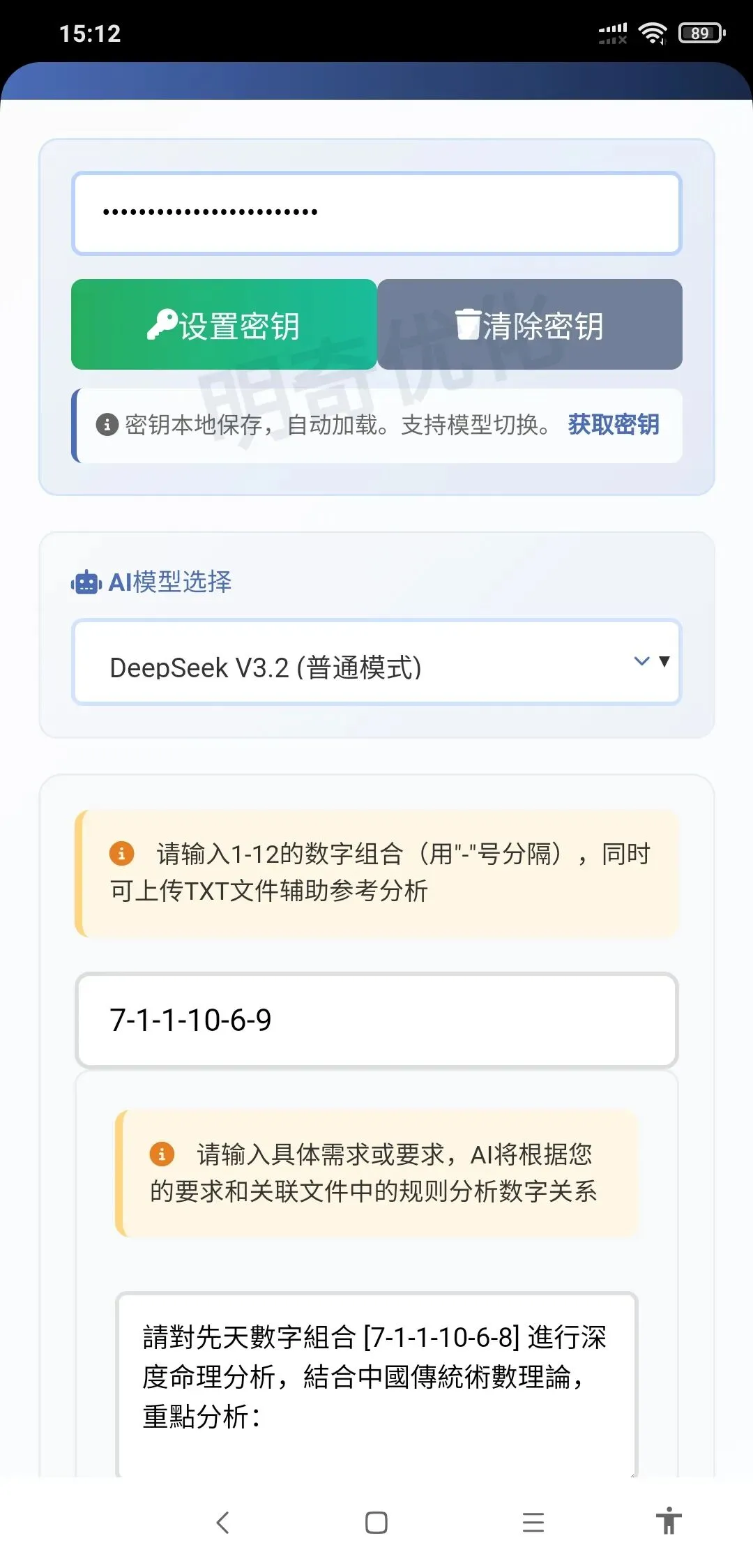 全方位接入大模型deepseek辅助分析,能够自动输入起盘数字和需求提示词,手动输入密钥一次,点执行分析即可不到一分钟生成对应分析。