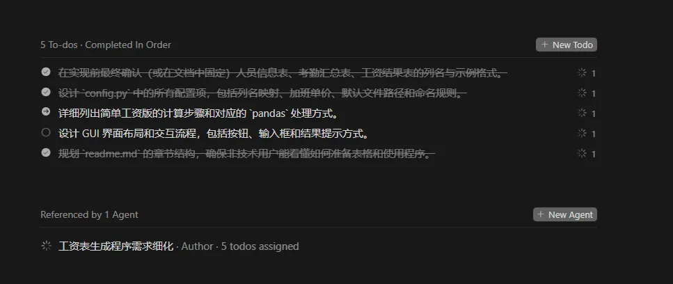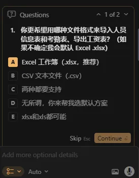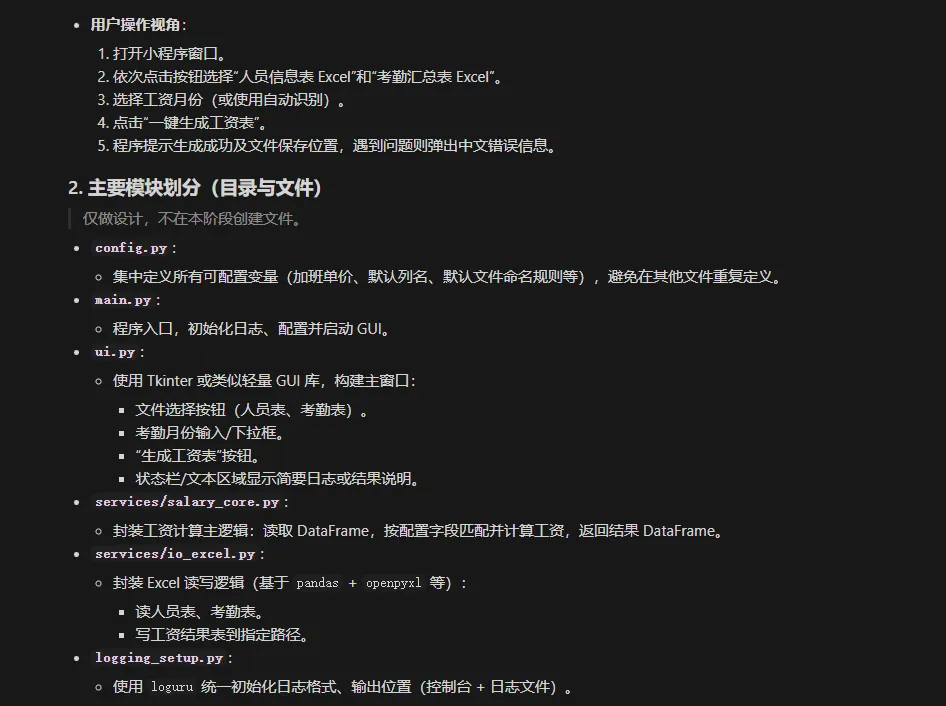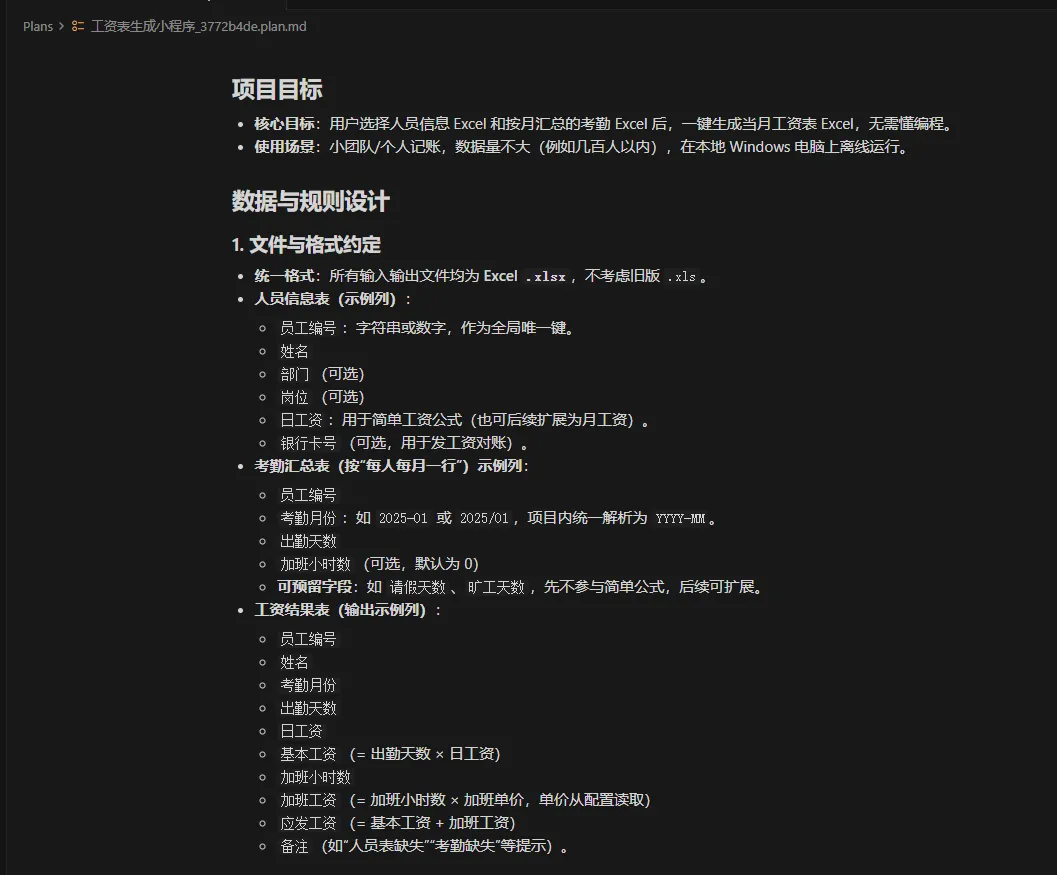 需求明确后,我们就可以打开 Cursor,开始生成代码了。在 Cursor 的输入框中,我们输入:“我需要用Python来编写一个小程序,用户可以导入人员信息表和工人的考勤表,生成用户的工资表,先不写代码,细化我的需求,并生成项目的规则” 。
