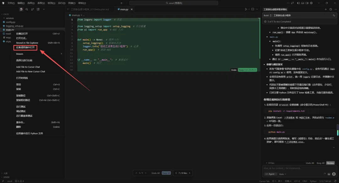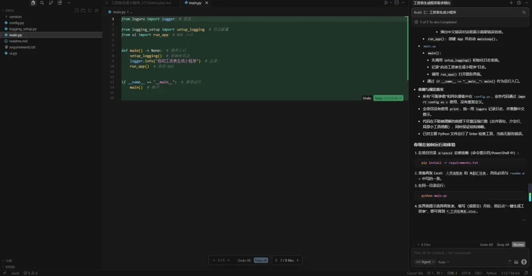 生成的代码已经很接近我们的需求了,但在实际运行之前,我们还需要对代码进行一些完善,以及继续优化界面或者添加功能。当然你还可以对需要处理的excel表格截图发给cursor,告诉他需要处理的数据,以及想要输出后得到的数据。当然如果有错误,也可以将错误信息截图或者复制发给cursor。